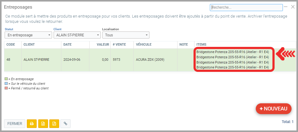 Vous y trouverez les pneus entreposés pour le client et le véhicule sélectionnés au Point de Vente.