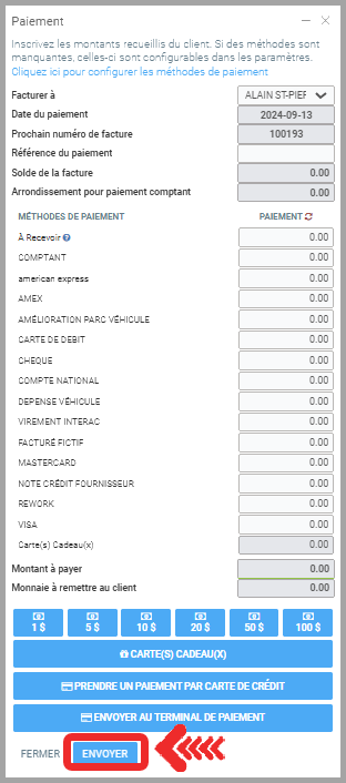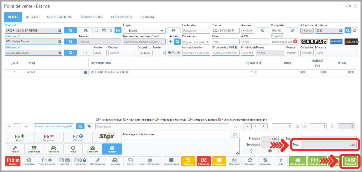Procédez au Paiement même si le solde est à 0$ pour sortir les pneus de l'entreposage dans le système.