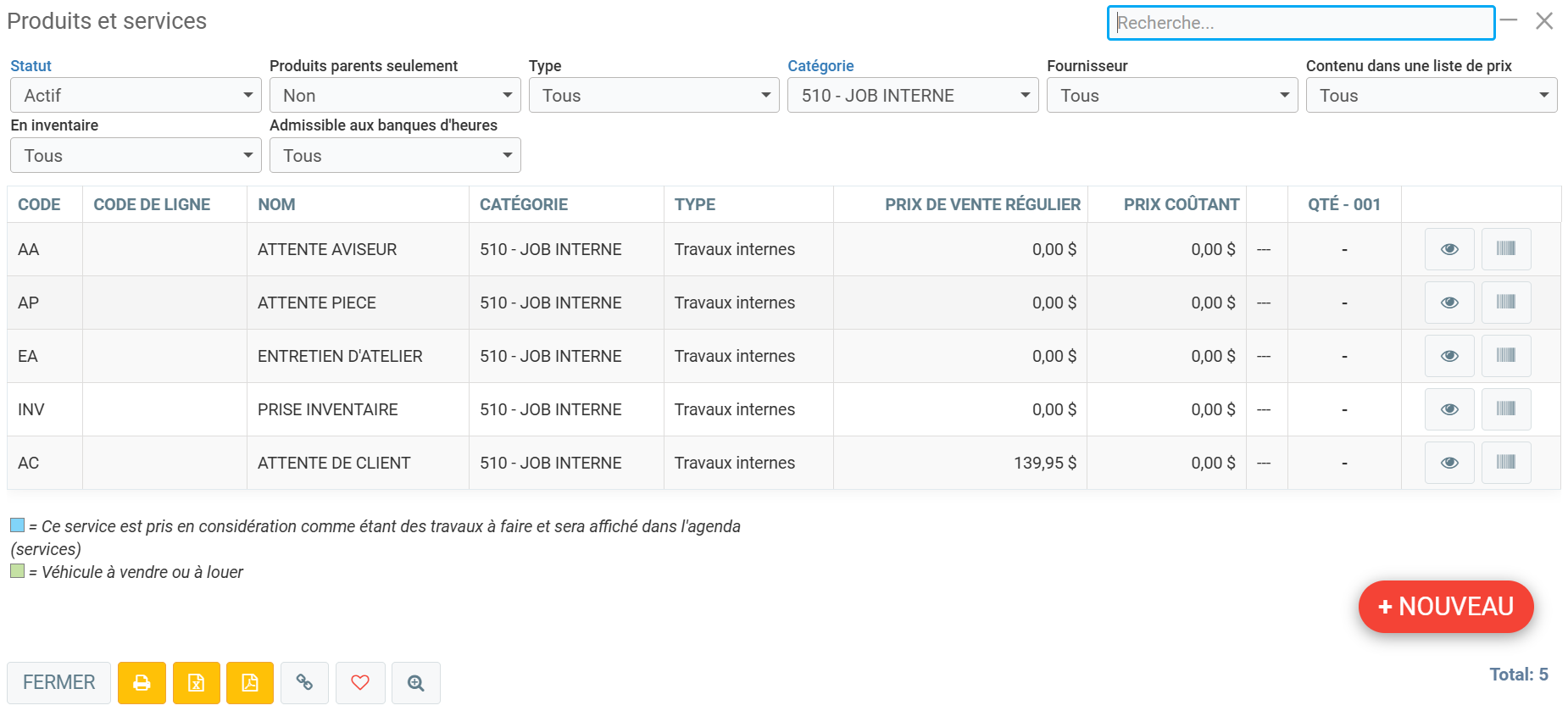 La fenêtre suivante montre les produits et services que vous pouvez ajouter au Contrôle du temp. Si vous avez besoin d'un nouveau produit, cliquez sur le bouton rouge +Nouveau pour inclure un nouveau travail.