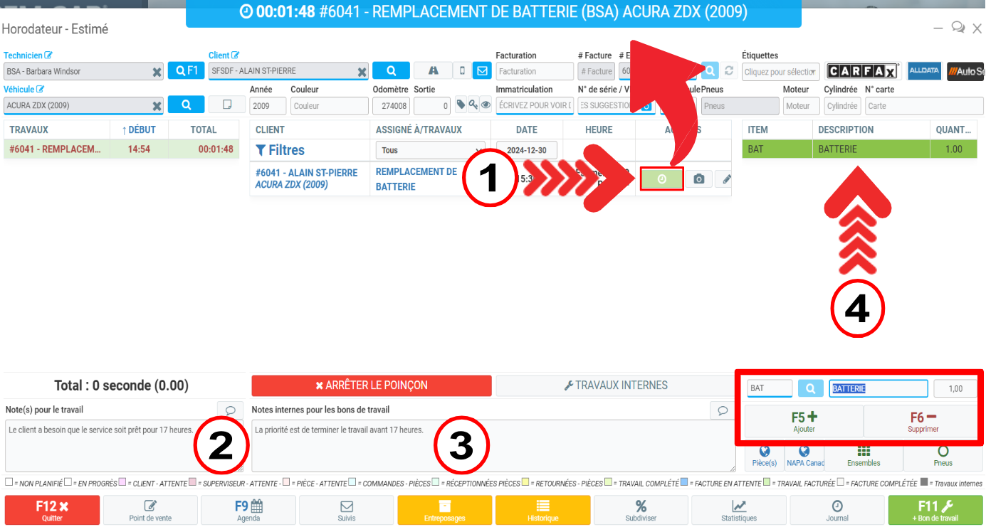 Ensuite, vous pouvez inclure des Note(s) pour le travail, des Notes internes pour les bons de travail, et vous pouvez ajouter des produits et des services en cliquant sur F5 + Ajouter.
