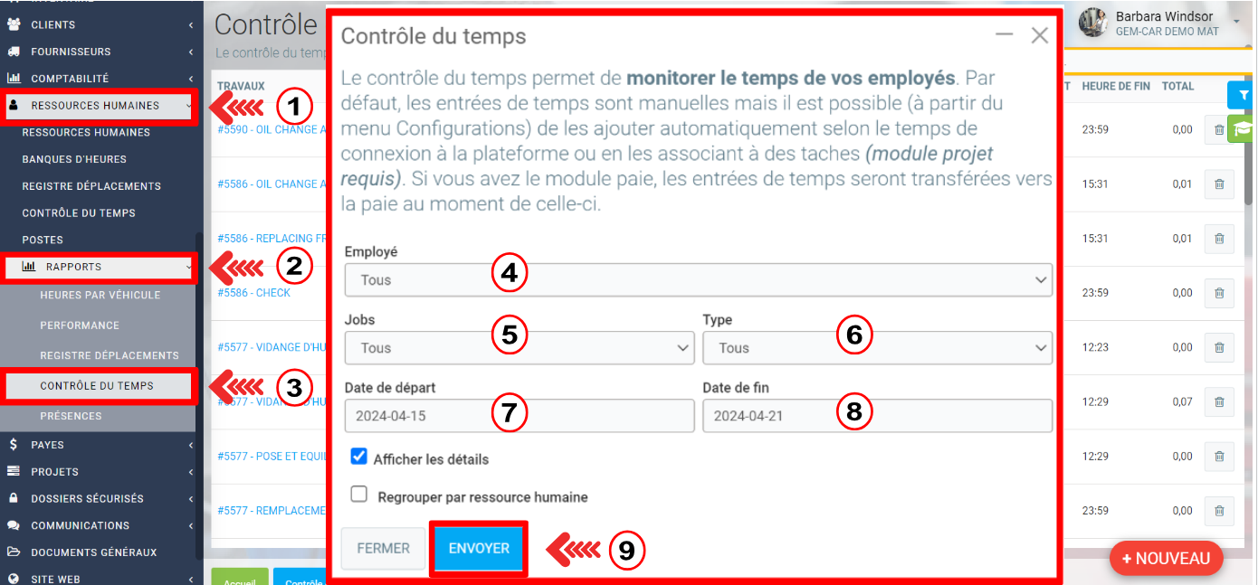 Pour faciliter le décompte et la facturation des heures prestées, GEM-CAR propose des rapports de temps précis, tenant compte des heures saisies dans l'horodateur.