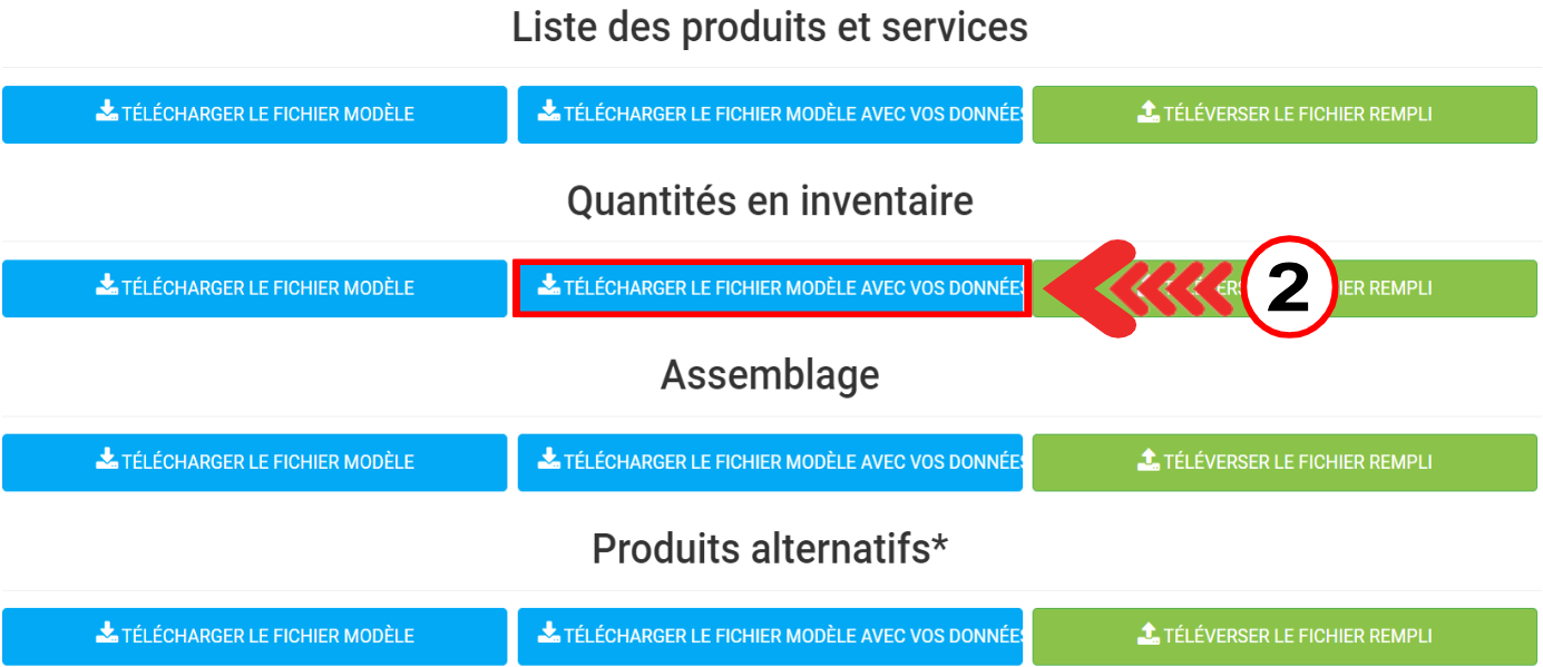 Mais si vous cliquez sur Produits et services, vous pouvez créer un PDF avec vos données, en cliquant sur le bouton bleu "Télécharger le fichier modèle avec vos données".