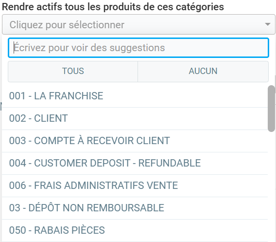 Dans l'option Rendre actifs tous les produits de ces catégories, vous pouvez sélectionner toutes les catégories, aucune ou seulement certaines catégories que vous souhaitez rendre actives les produits. Si vous cliquez sur la fenêtre, le menu déroulant affiche les options parmi lesquelles vous pouvez choisir.