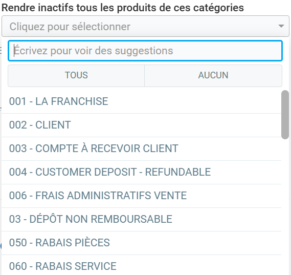 Dans l'option Rendre inactifs tous les produits de ces catégories, vous pouvez choisir de rendre inactifs les produits de toutes les catégories, d'une seule ou d'aucune d'entre elles. Cela permet de réduire le nombre de données inutiles, surtout si elles ne sont pas à jour ou si elles ne sont plus pertinentes à ce moment-là. Si vous cliquez sur la fenêtre, le menu déroulant affiche les options parmi lesquelles vous pouvez choisir.