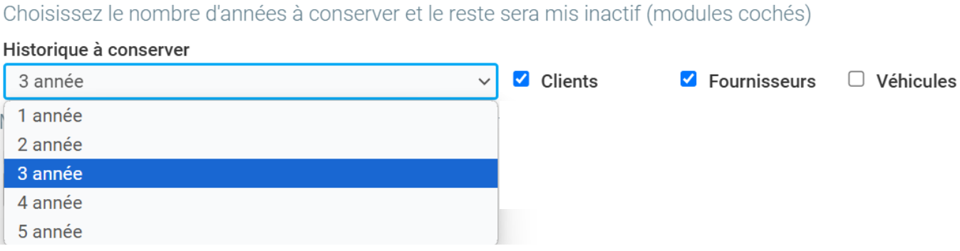 Choisissez le nombre d'années à conserver et le reste sera mis inactif (modules cochés). Les options de temps dans l'historique à conserver sont les suivantes:
