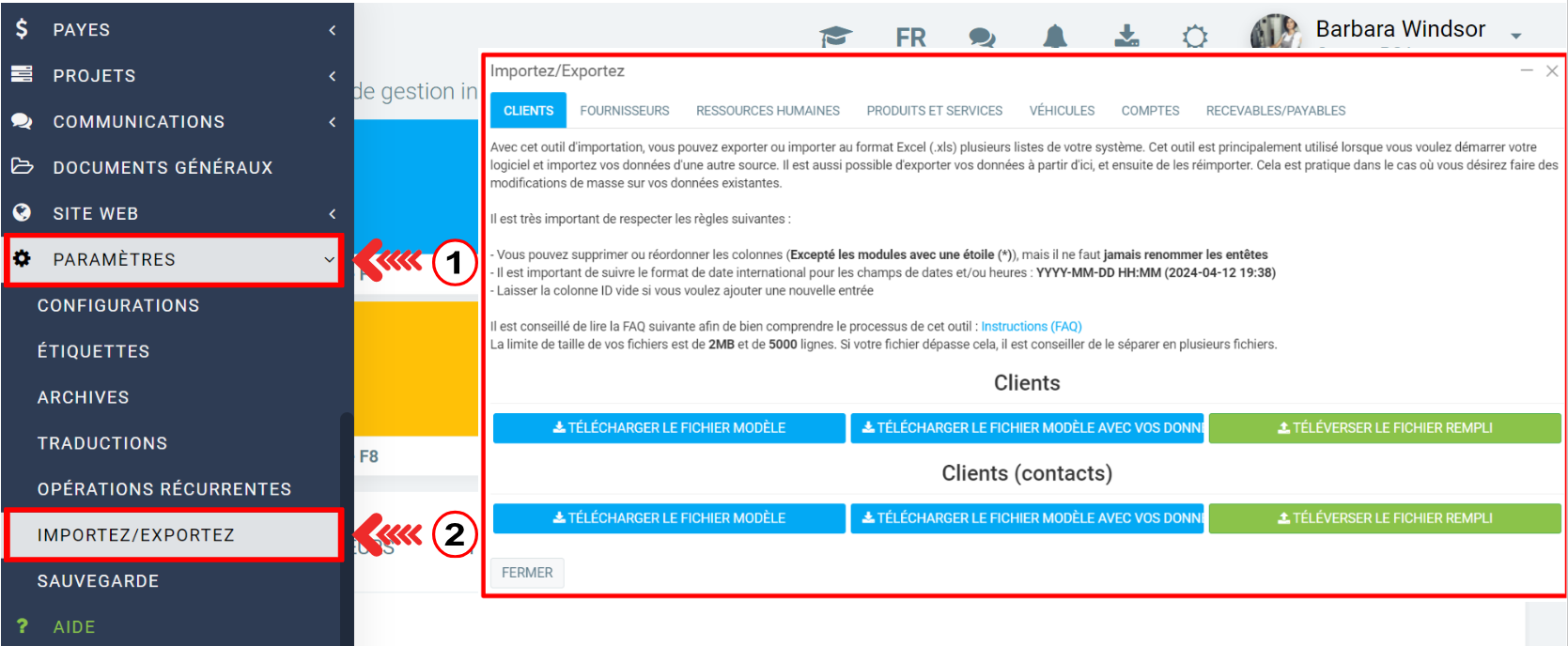Si vous êtes connecté sur GEM-CAR avec un utilisateur qui a le droit "Importation de données" sur son rôle, vous aurez accès au menu Paramètres > Importez/Exportez.