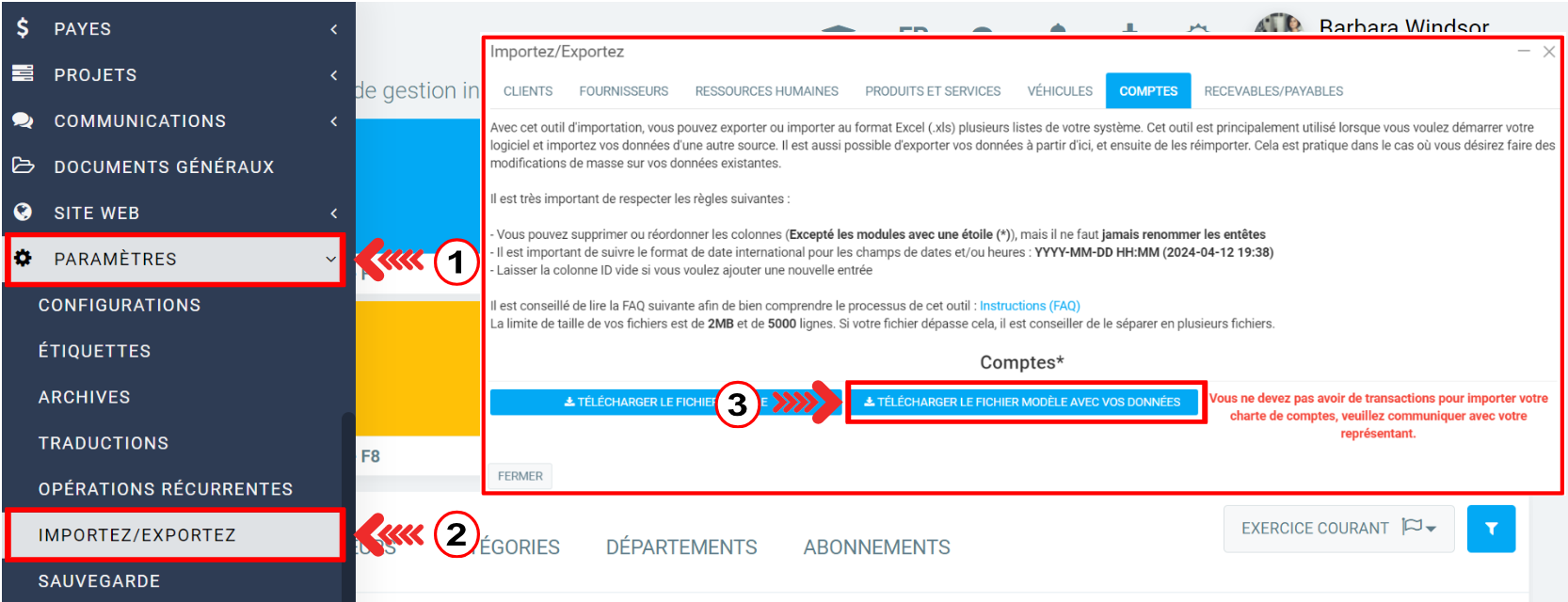 Une fenêtre apparaît. Cliquez sur l'onglet Comptes et ensuite sur le bouton bleu Télécharger le fichier modèle avec vos données.