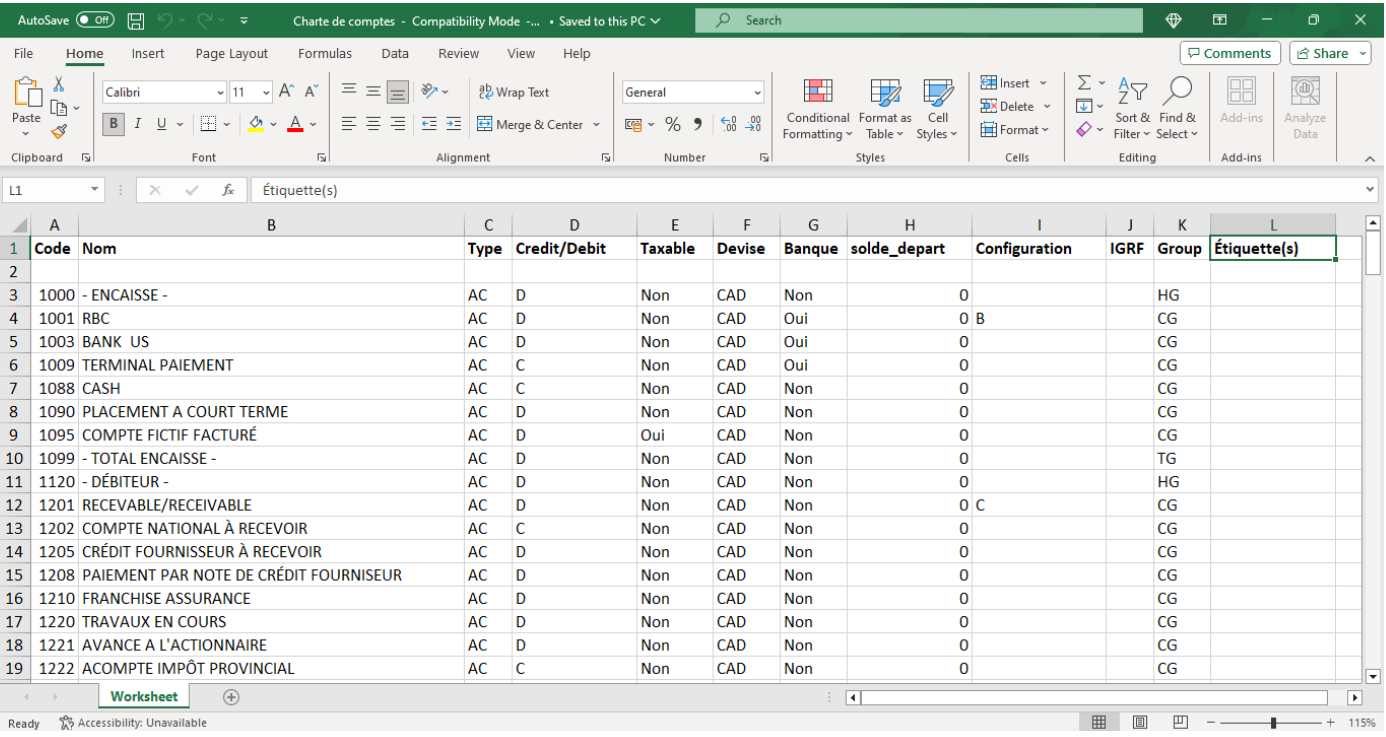 Pour importer une charte de comptes à partir d'un fichier Excel, vous devez d'abord exporter un gabarit que vous pourrez modifier par la suite.