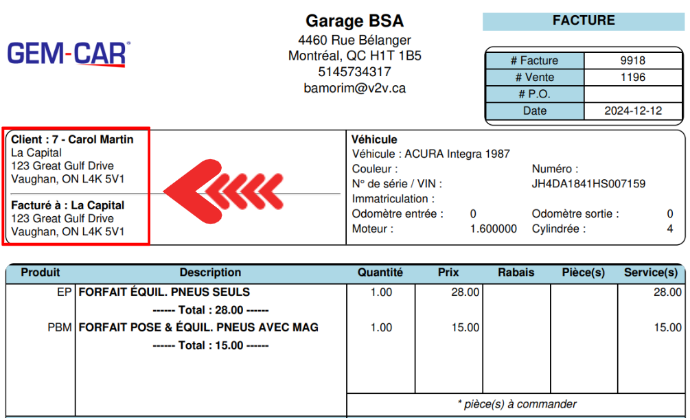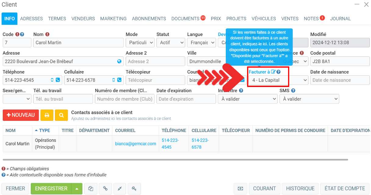 Si vous sélectionnez l'option Désactiver la mention "Facturer à" dans les clients, la désactivation de l'option "Facturer à" permet de simplifier les documents, de les rendre plus clairs et de ne présenter que les informations essentielles. Il s'agit d'une option présente dans le dossier du client.