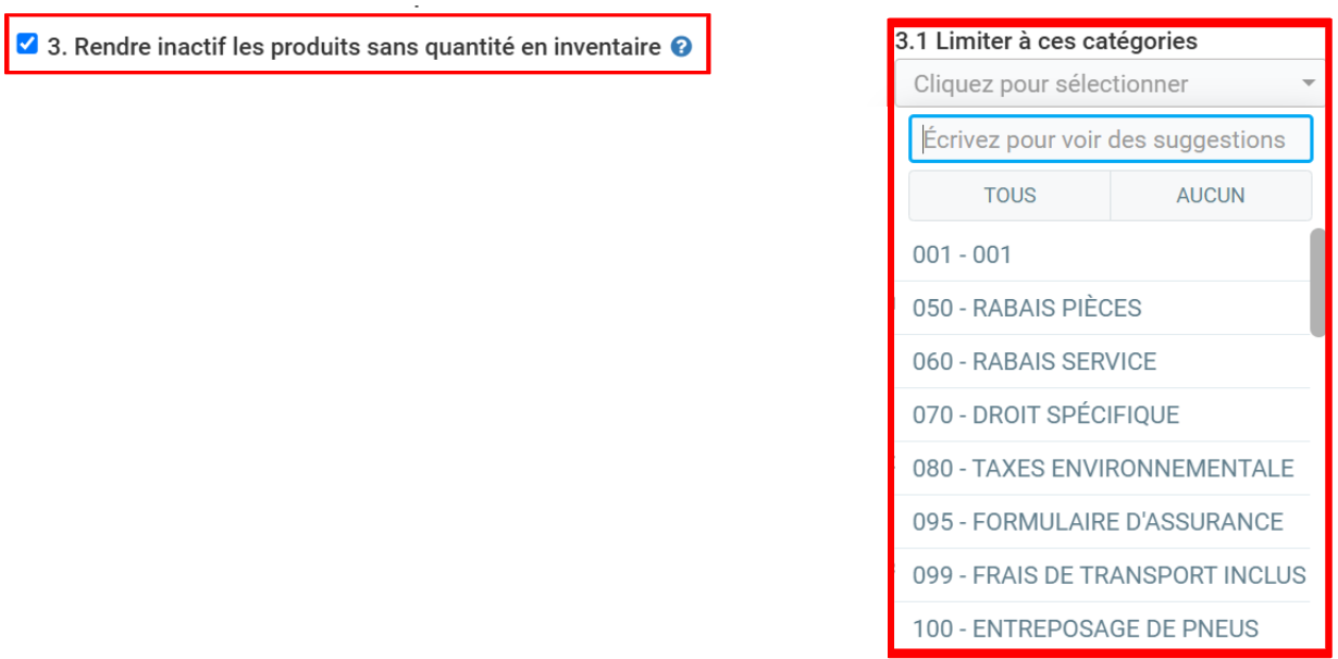 Si vous sélectionnez l'option Rendre inactif les produits sans quantité en inventaire, les produits qui ne sont pas disponibles dans l'inventaire sont automatiquement marqués comme inactifs.