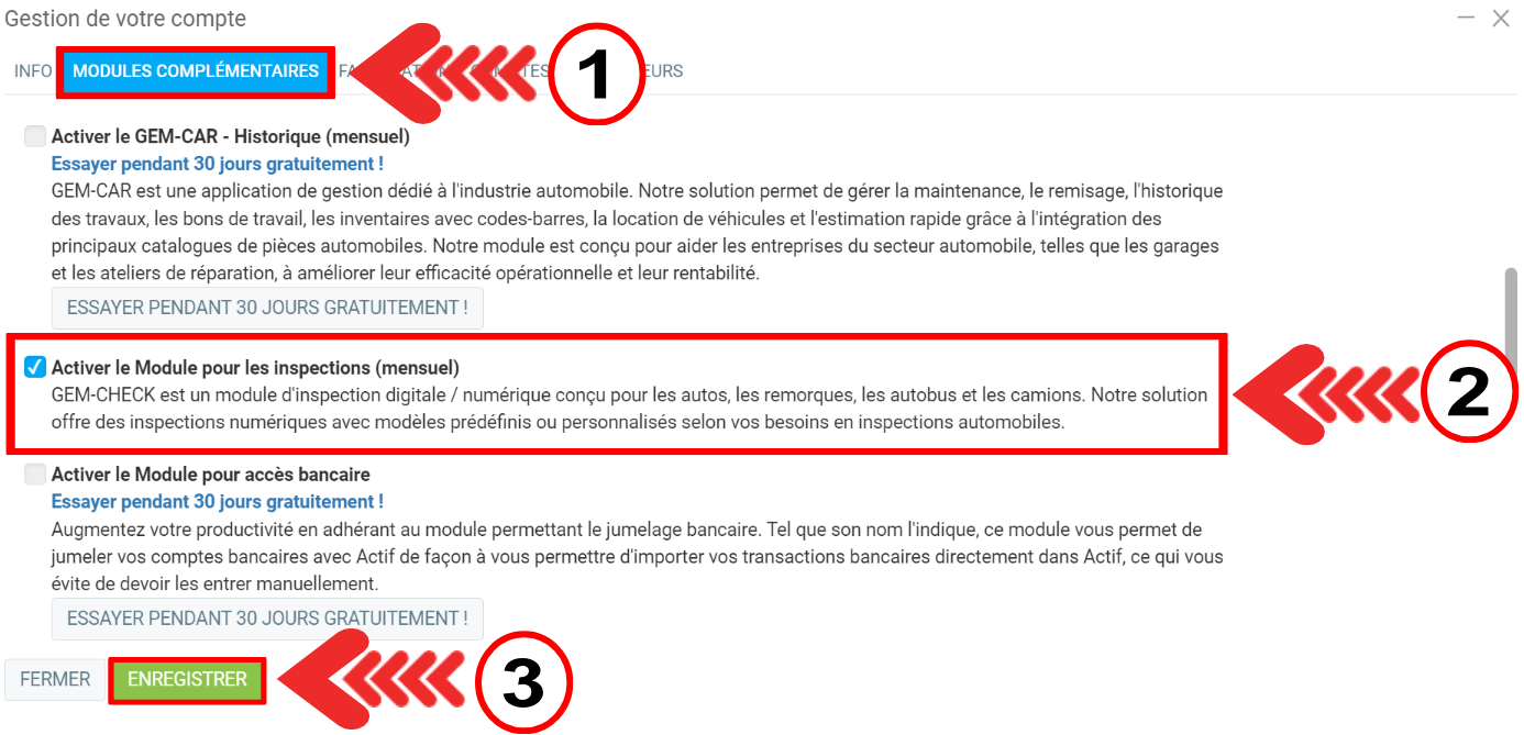 Sélectionnez Activer le Module pour les inspections (mensuel).