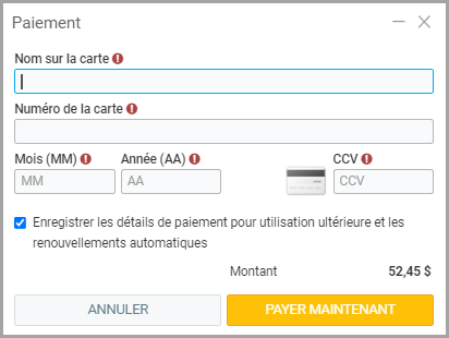 Entrez les informations de la carte de crédit pour le paiement mensuel du nouvel abonnement et cliquez sur Payer maintenant.
