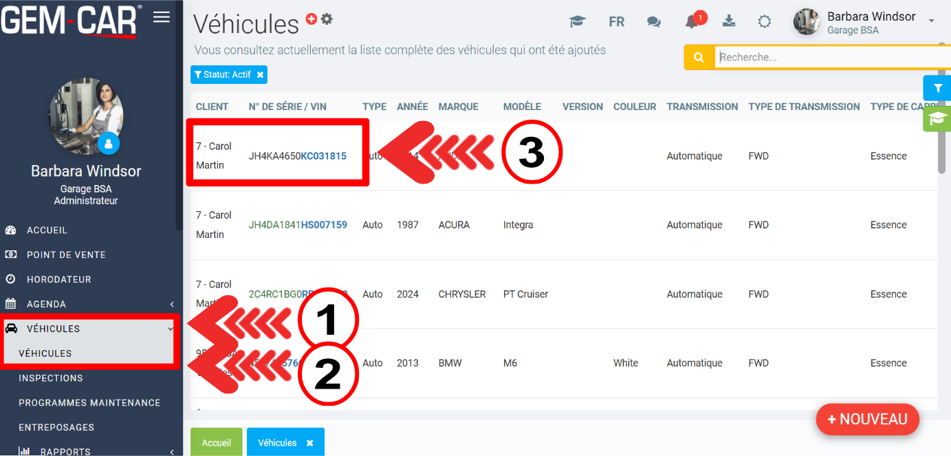 Pour compléter l’inspection, cliquez sur le menu principal à gauche > Véhicules > Inspections.