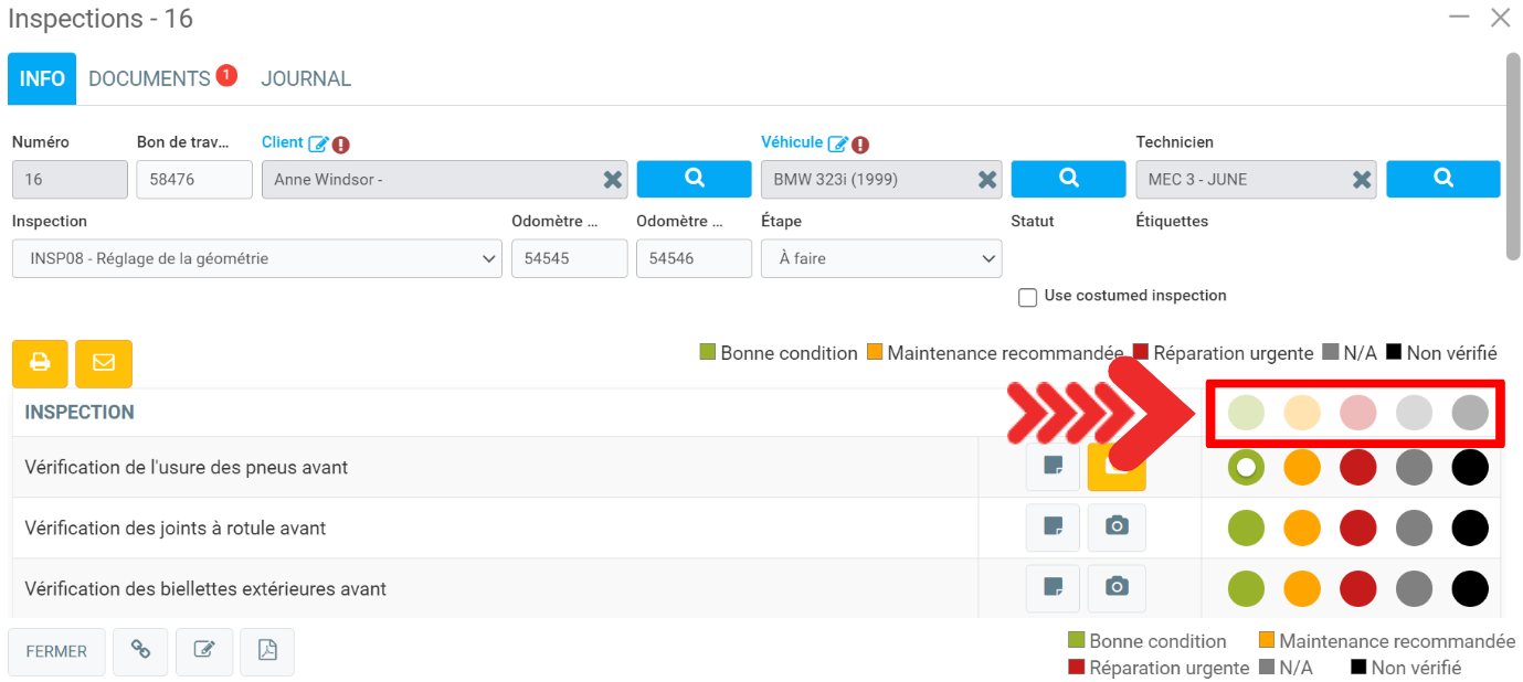 Sur le formulaire d’inspection et pour chaque article, sélectionnez le point correspondant à l’évaluation de l’aspect inspecté. Voici une copie de la légende:
