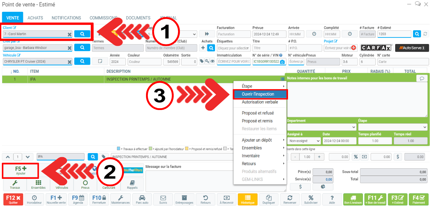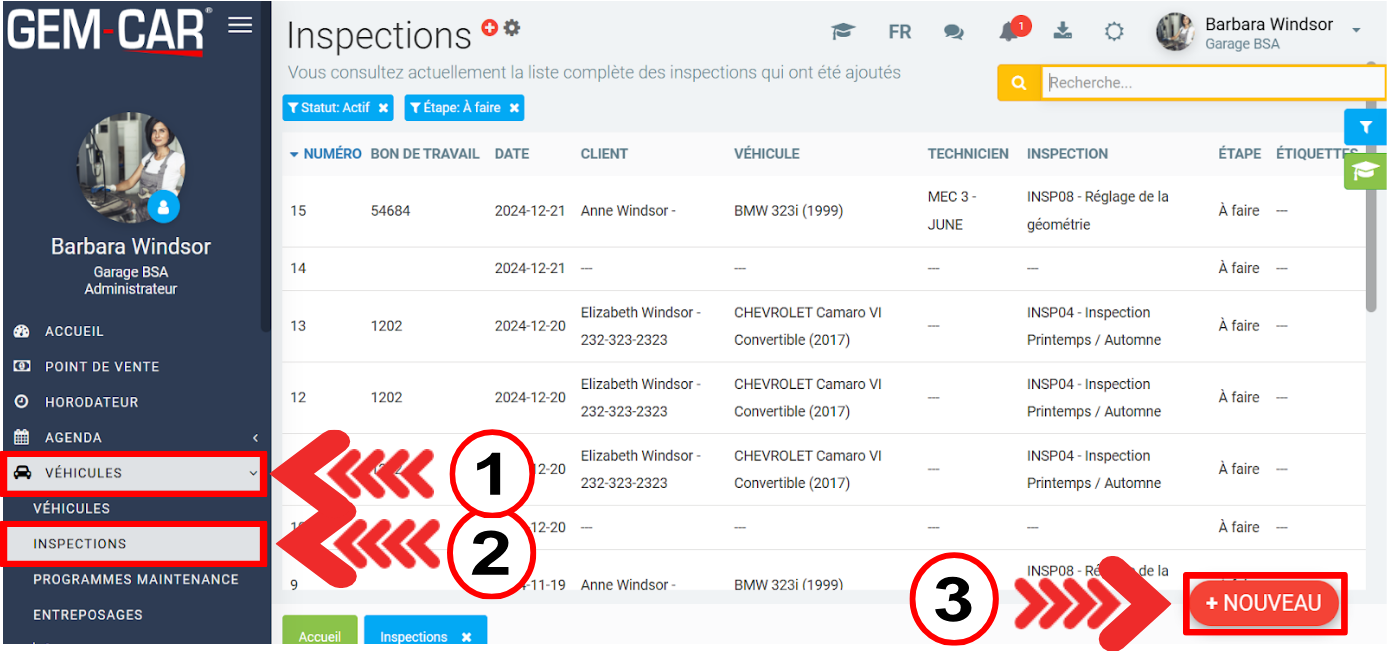 Dans le menu de gauche, cliquez sur Véhicules > Inspections > +Nouveau.