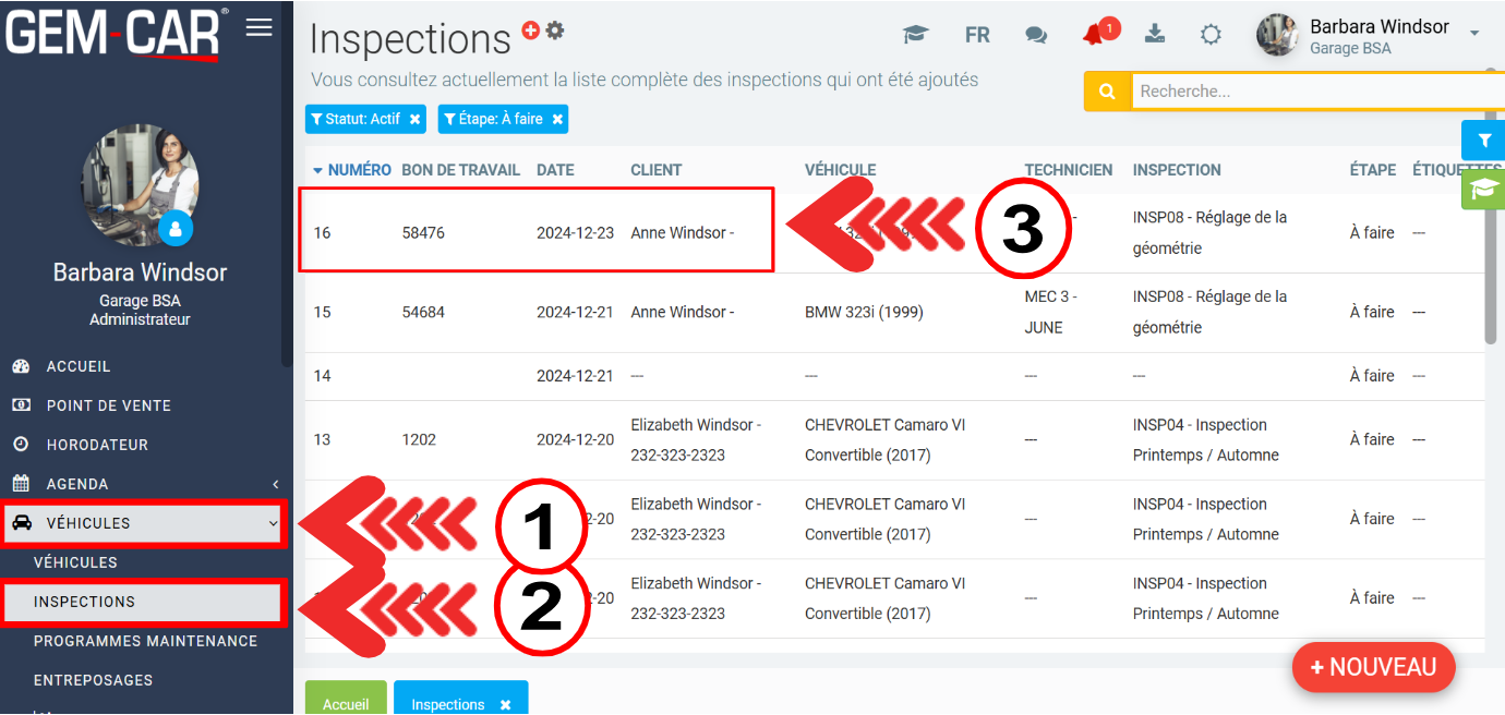 Pour imprimer ou envoyer un rapport d’inspection, cliquez sur le menu principal de gauche Véhicules > Inspections.