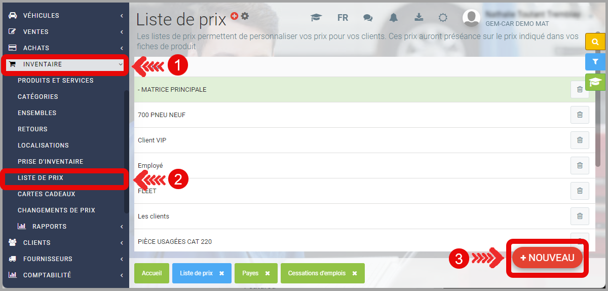 - À partir du menu principal situé à gauche de l'application, cliquez sur Inventaire > Liste de prix > +Nouveau.