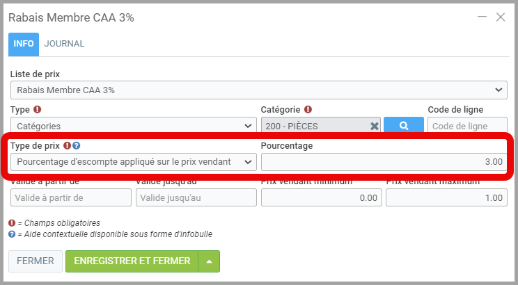 - Après avoir sélectionné le Type et la Catégorie de produits, appliquer le Type de prix Pourcentage d'escompte appliqué sur le prix vendant et le Pourcentage souhaité. À titre d'exemple, vous pourriez choisir d'appliquer un rabais de 3%.