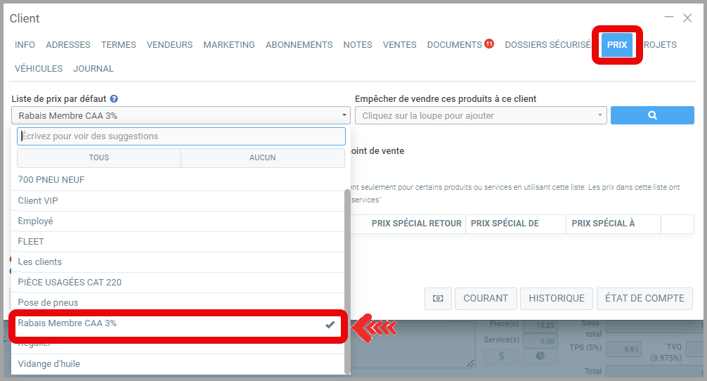 - Sous l'onglet Prix, Sélectionnez la Liste de prix par défaut que vous avez configuré pour le rabais: Rabais Membre CAA 3% par exemple.