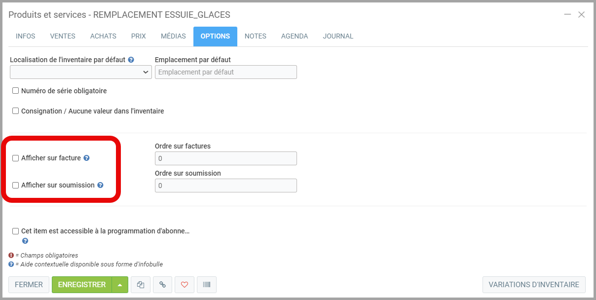 - Décochez Afficher sur facture et Afficher sur soumission pour le produit de main d'oeuvre.