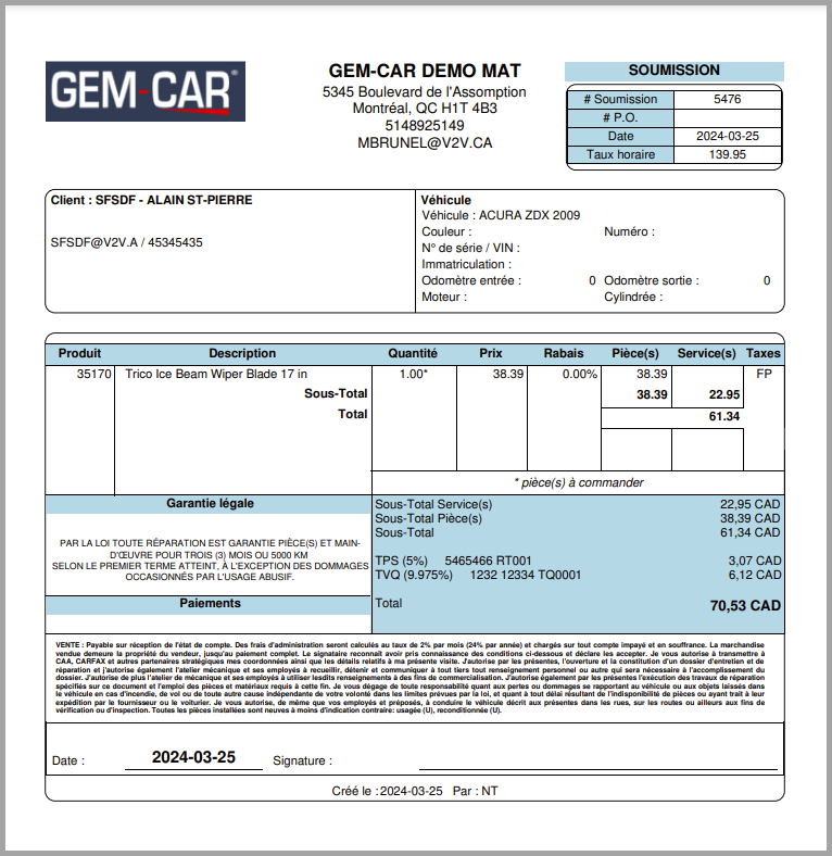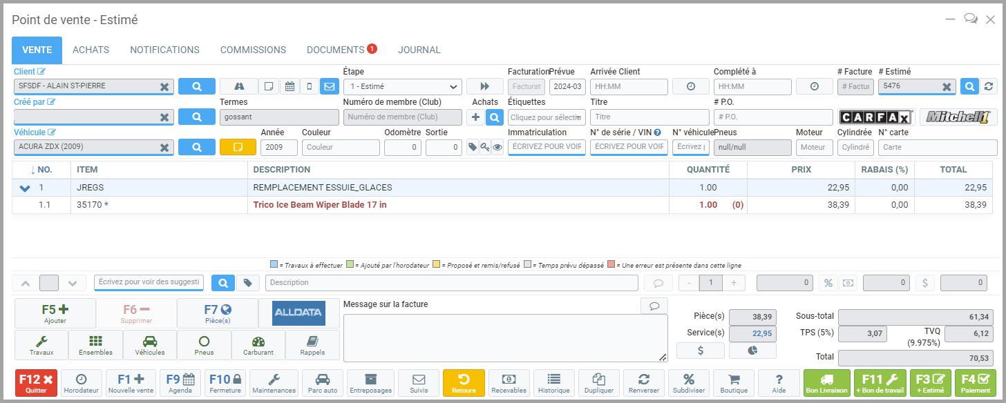 - Dans le Point de vente, ajoutez la main d'oeuvre et la pièce. Par exemple, vous pouvez ajouter le remplacement d'essuie-glaces et les essuies-glaces.