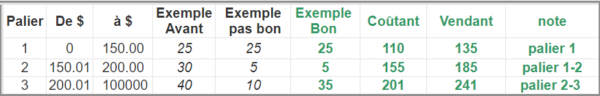 Avec la matrice progressive, le prix de vente sera calculé en tenant compte de 2 "paliers" de prix pour un item dont le coûtant est de 15$