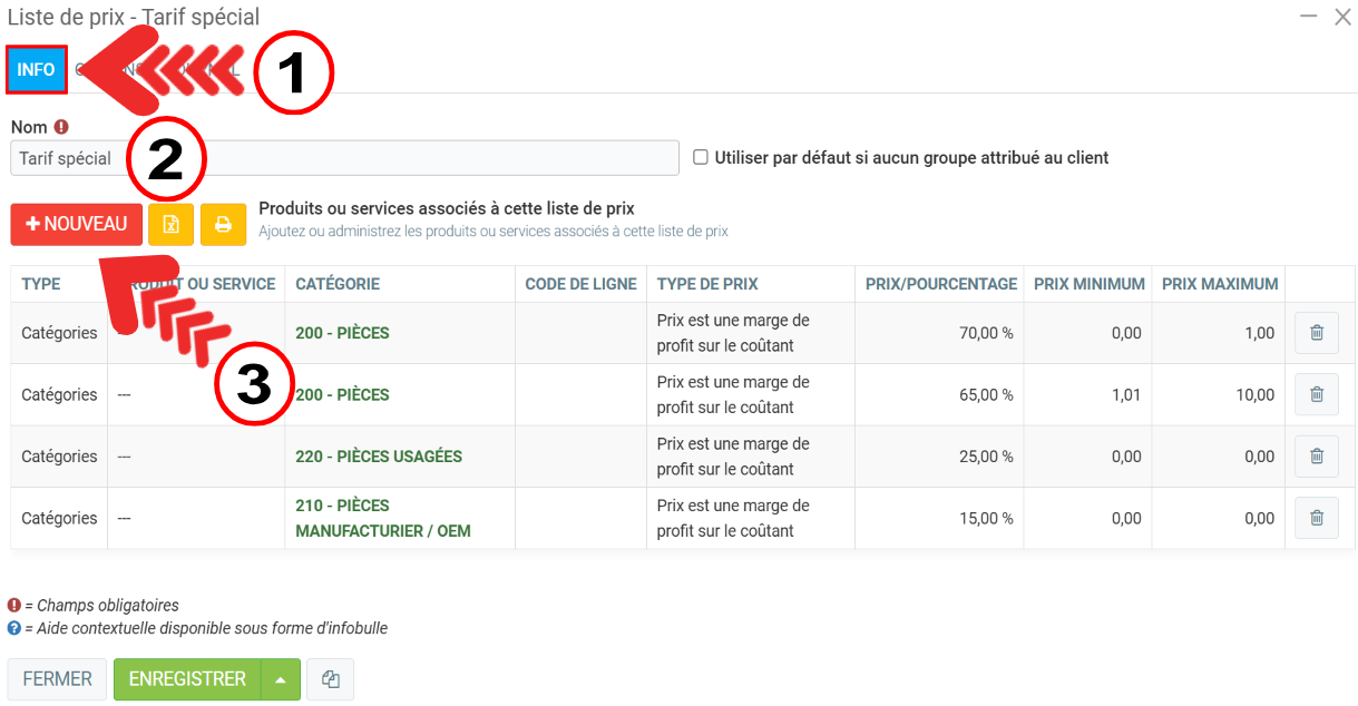 Après avoir attribué un nom à la liste, dans l'onglet Info, cliquez sur +Nouveau à côté de Produits ou services associés à cette liste de prix, pour créer la matrice de base.