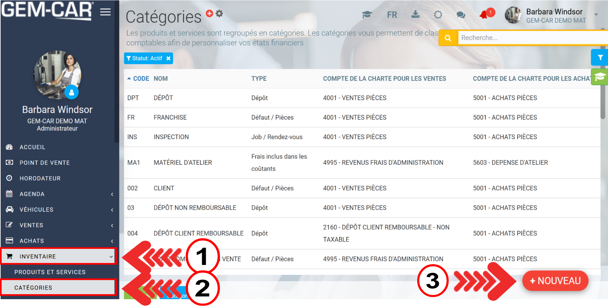 Cliquez sur le bouton +Nouveau en rouge situé en bas à droite pour créer une nouvelle catégorie.