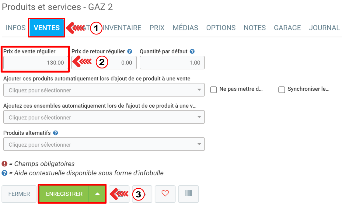 Dans l'onglet Ventes, saisissez le Prix de vente régulier et cliquez sur Enregistrer.