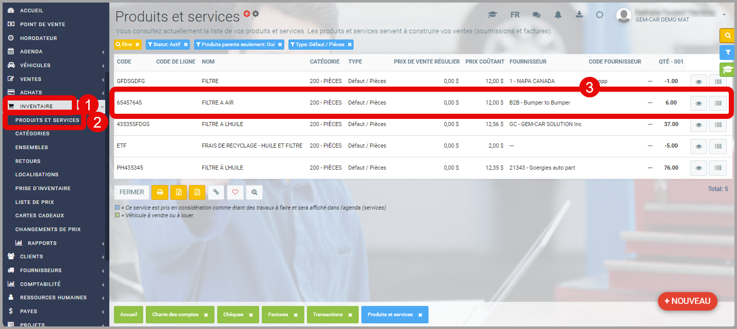 - Modifier le prix régulier: À partir du menu principal situé à gauche de l'application, cliquez sur Inventaire > Produits et Services > Sélectionnez le Produit ou Service pour lequel vous souhaitez modifier le prix.