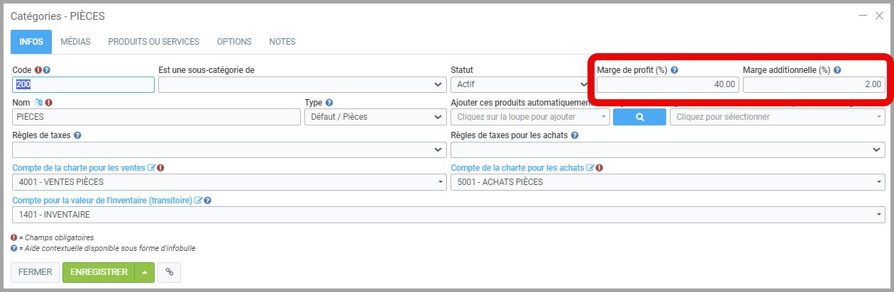 - La marge de profit: elle est inscrite dans la catégorie du produit. Pour modifier la marge de profit, à partir du menu principal, cliquez sur Inventaire > Catégorie. En modifiant celle-ci, souvenez-vous que vous modifiez le prix de vente de TOUS les produits de la catégorie.