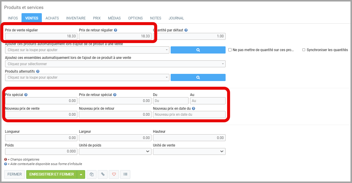 Sous l'onglet Vente, vous pouvez modifier le prix de vente et de retour régulier.