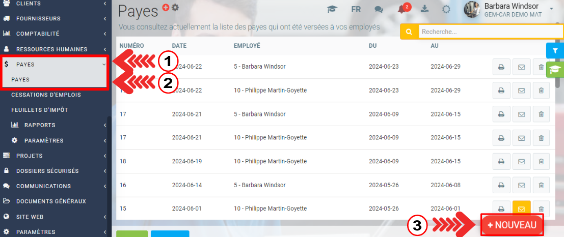 Dans Actif, allez dans le menu Paies > Paies > +Nouveau afin de créer une nouvelle paie.