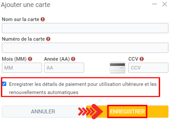 Cochez la case "Enregistrer les informations de paiement pour une utilisation future et le renouvellement automatique" afin que vos informations de carte de crédit restent dans votre dossier pour une utilisation ultérieure ou pour le renouvellement automatique des abonnements.
