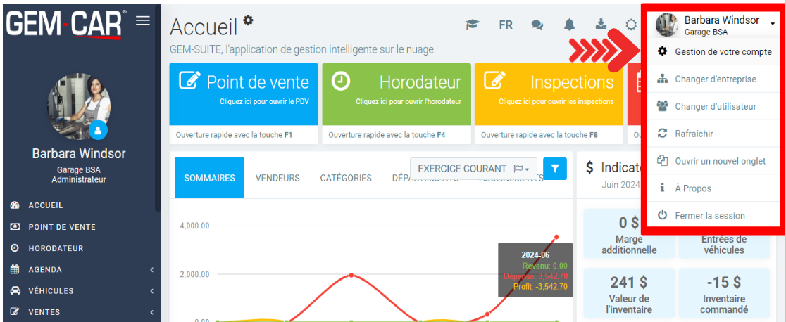 Cliquez dans le coin supérieur droit sur la flèche située à côté du nom de l'entreprise et cliquez sur Gestion de votre compte.