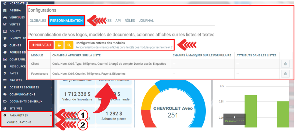 Vous verrez une section Configurations entêtes des modules pour paramétrer les colonnes affichées dans vos listes.