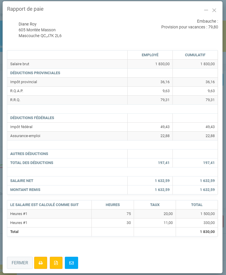 Afin de voir les cumulatifs, choisissez l'employé pour lequel vous désirez faire une paie de cessation, et puis insérez la période de paie pour laquelle il a travaillé chez vous. Vous pouvez simplement vider les champs "Date de départ" de "Date de fin" pour que l'ensemble des paies soient incluses dans le rapport. Vous pouvez ensuite cliquer sur Envoyer afin de produire le rapport. Voici un exemple de rapport que cela va produire :
