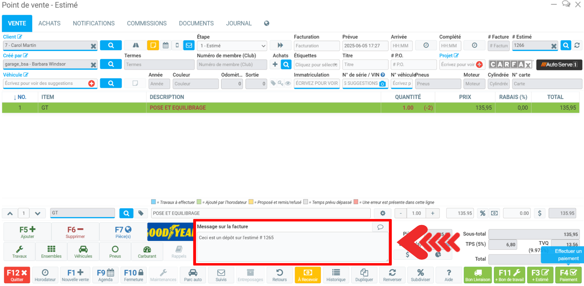 Une nouvelle fenêtre du Point de vente s'ouvrira et affichera un message au centre de la page, en bas, indiquant que la vente a été initiée sur une autre estimé, mais qui sera payée séparément.