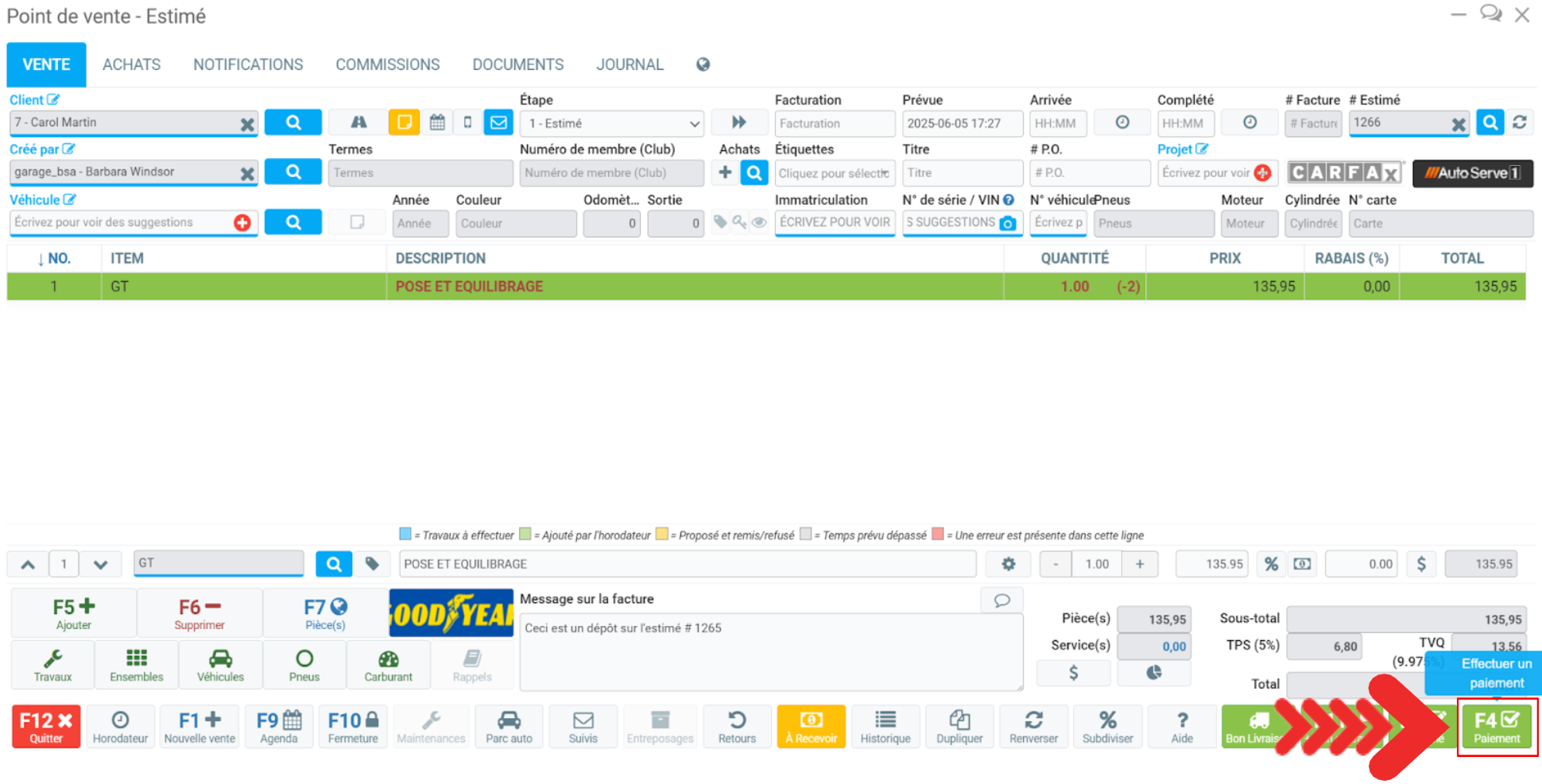 Vous pouvez maintenant payer le dépôt en appuyant simplement sur F4 ou sur le bouton vert de Paiement situé en bas à droite de l'écran.