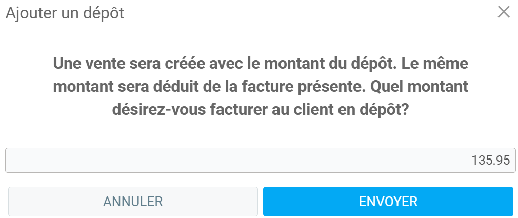 Une nouvelle fenêtre s'ouvre avec le message suivant: "Une vente sera créée avec le montant du dépôt. Le même montant sera déduit de la facture présente. Quel montant désirez-vous facturer au client en dépôt?"