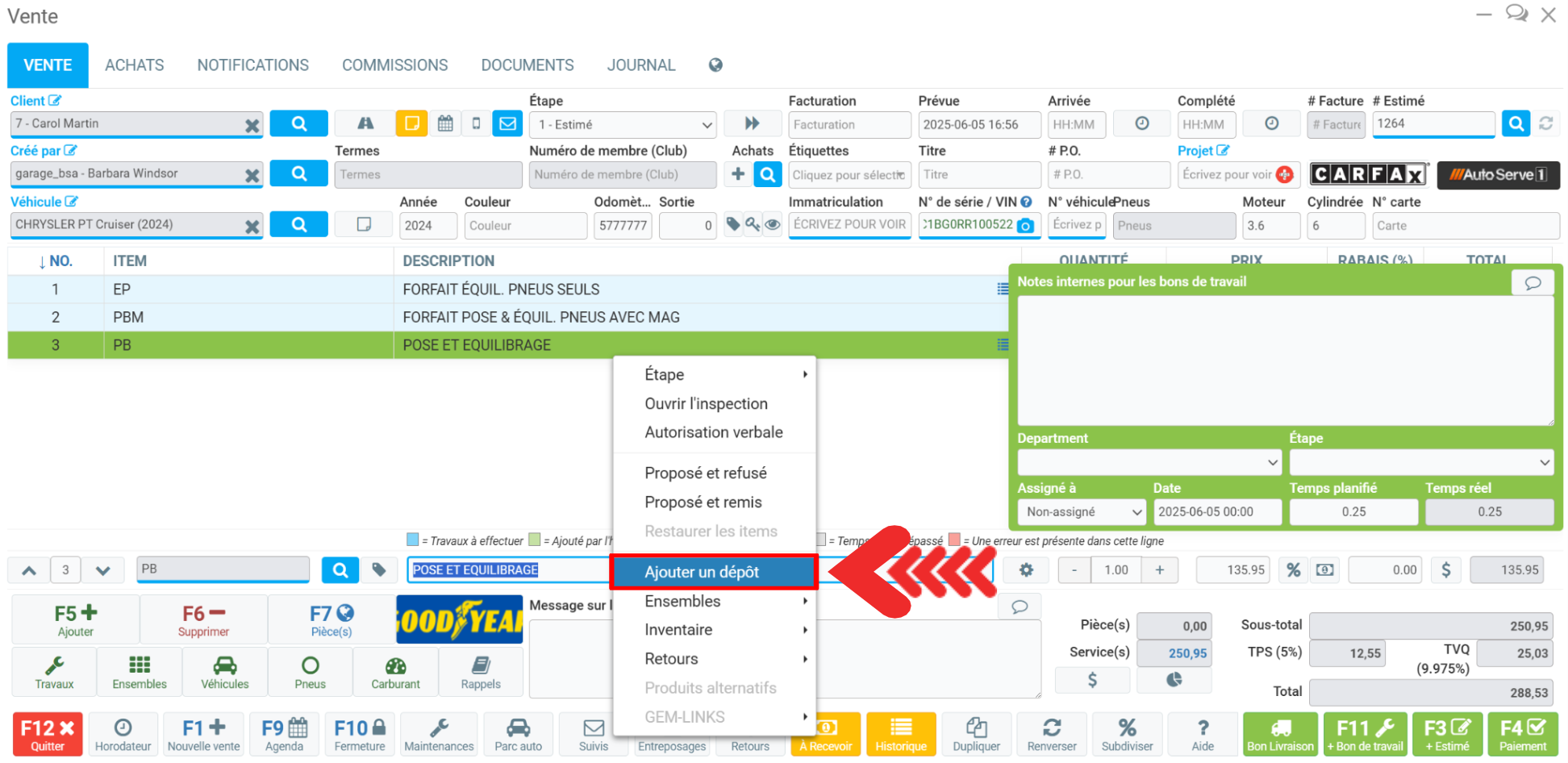 Une fois que votre devis est établi, faites un clique avec le bouton droit de la souris sur le travail pour lequel vous souhaitez obtenir un dépôt.