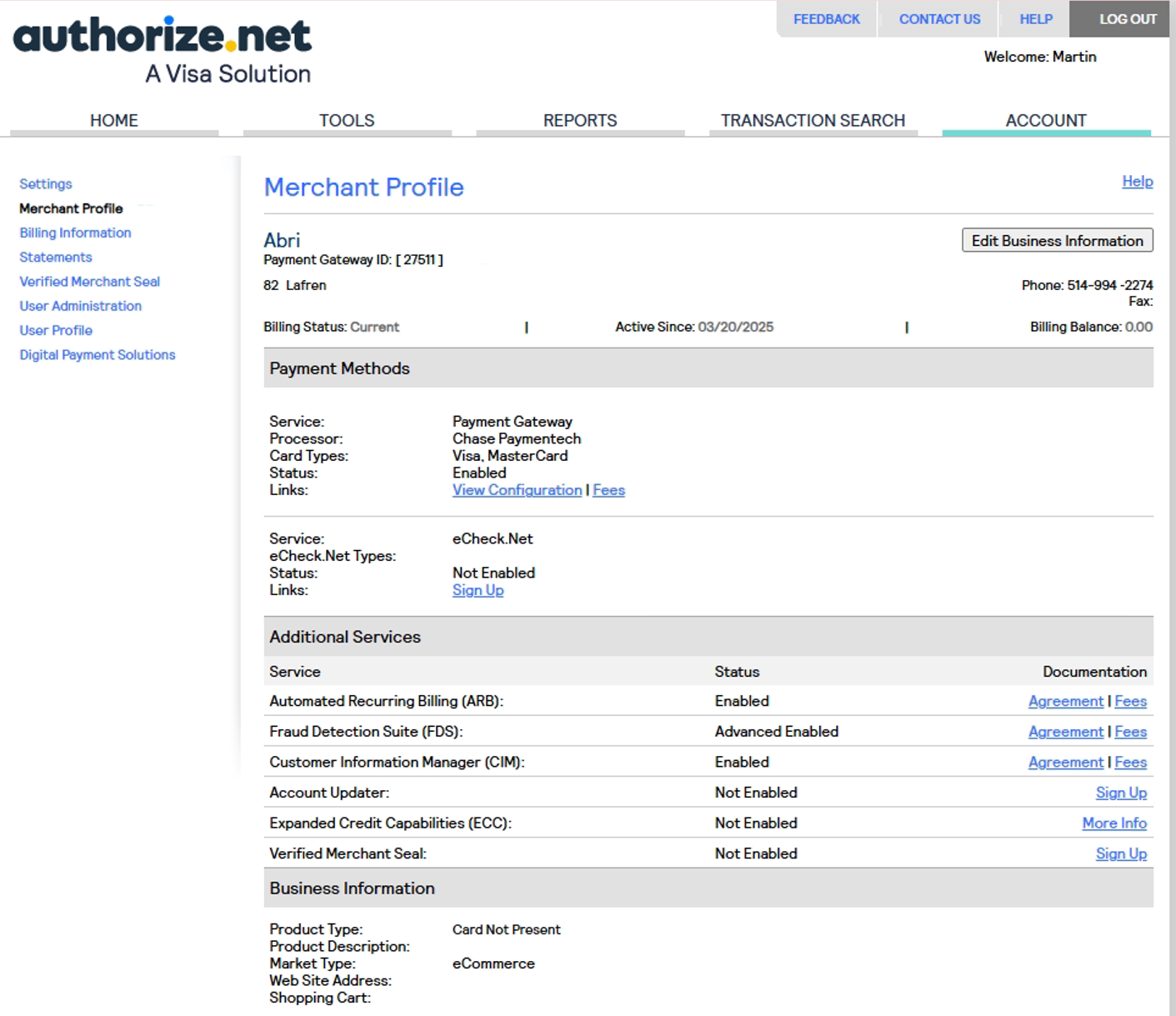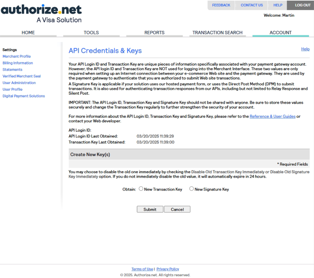 Les écrans du site Authorize.net se présentent comme suit pour les clés API et le profil.
