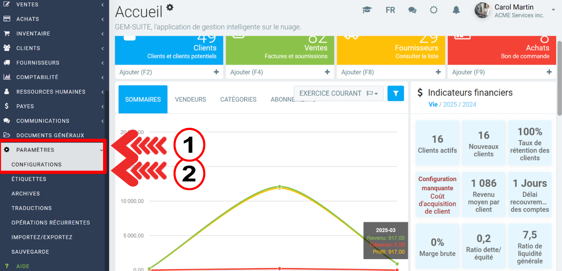 Dans le menu de gauche, cliquez sur le menu Paramètres > Configurations.