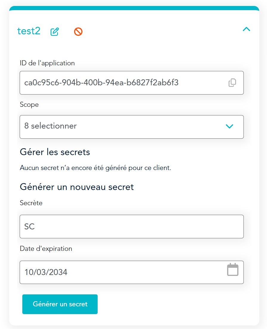 Une nouvelle ligne sera ajoutée à votre client et une autre information importante apparaîtra: le secret (important pour GEM-CAR), avec une date d'activation et d'expiration.