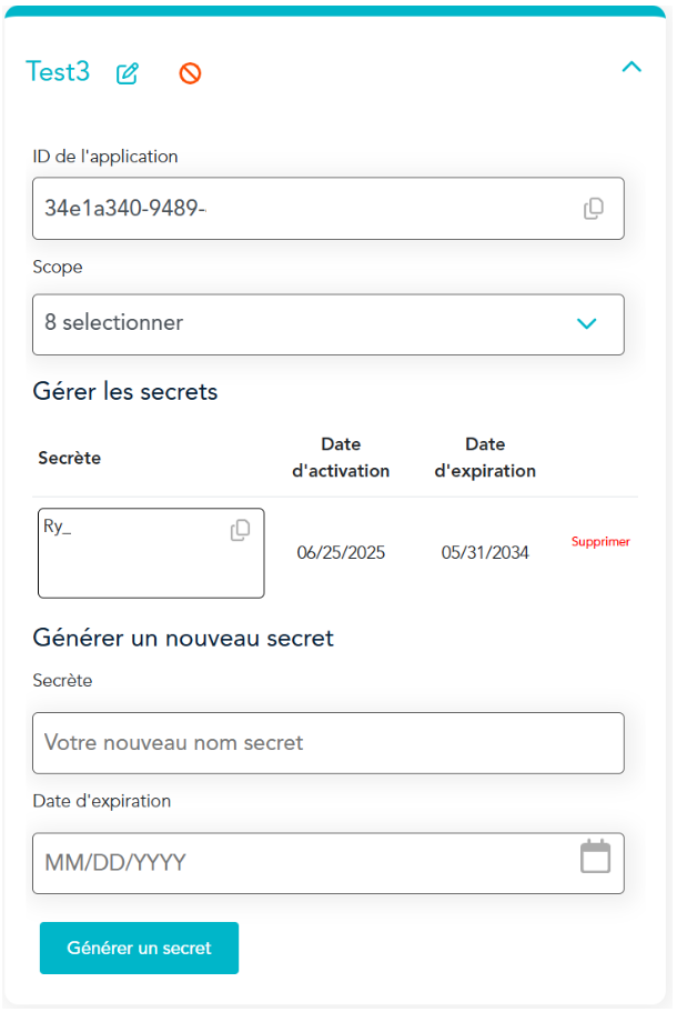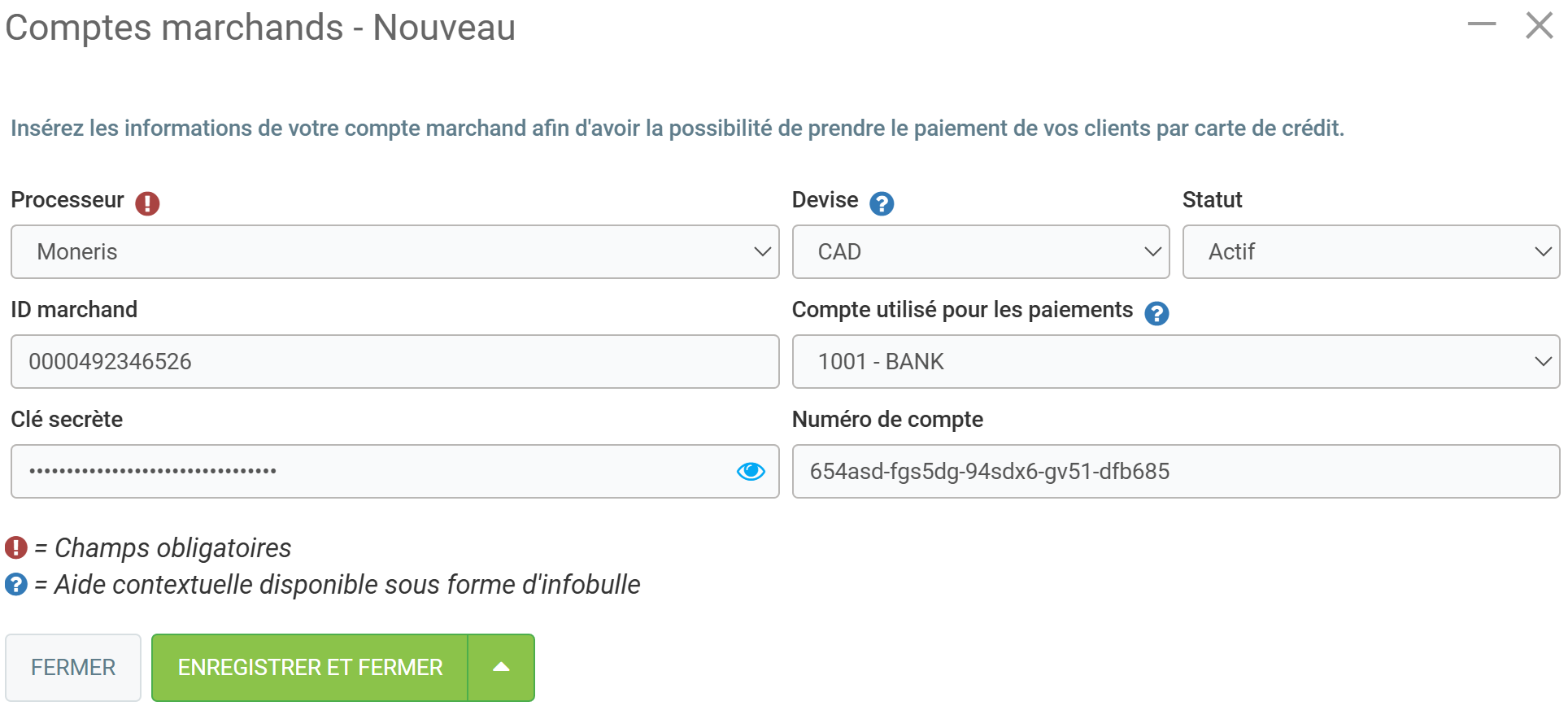 - Clé secrète (le secret généré sur le portail Moneris, avec une date d'activation et d'expiration)