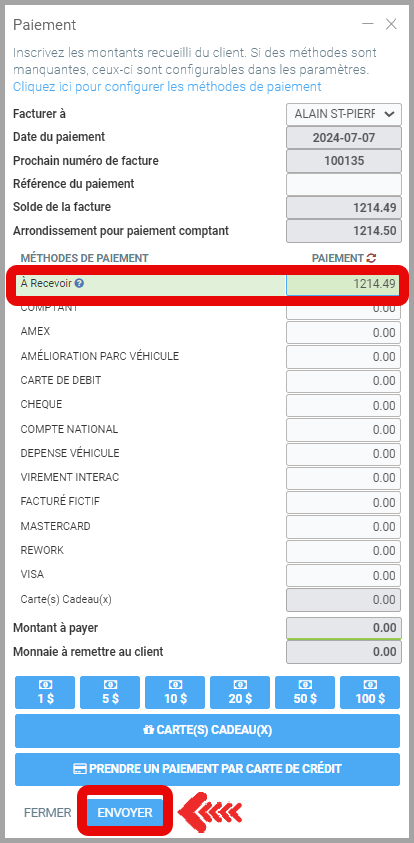 Pour la Méthode de paiement À Recevoir, inscrivez le montant à être payé et cliquez sur Envoyer.