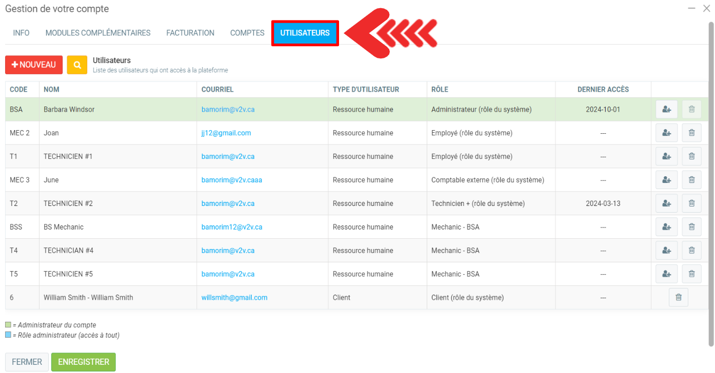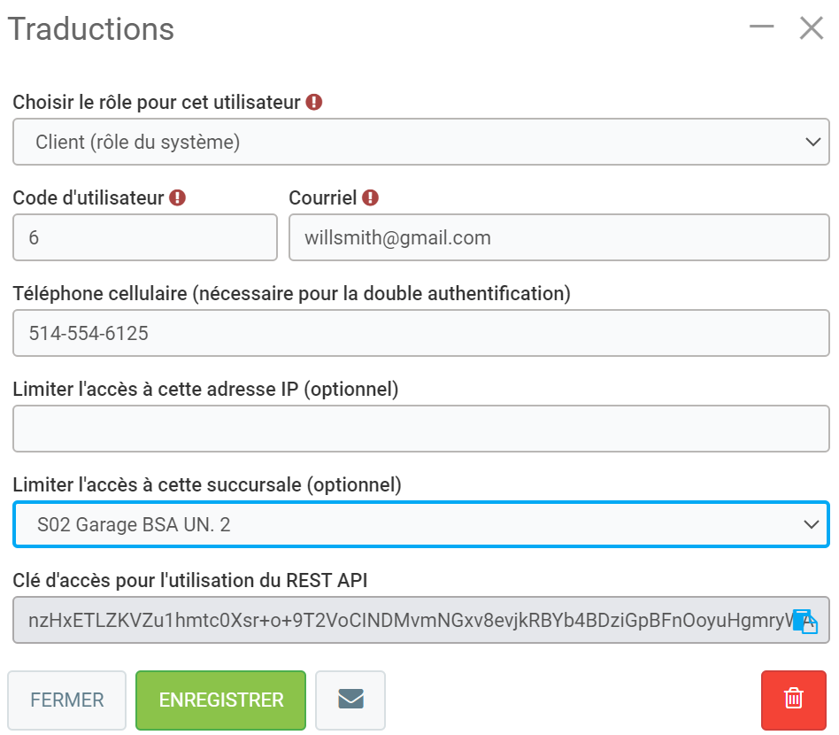 Vous pouvez désactiver l'accès en cliquant sur la corbeille rouge dans le coin droit de la page et vous pouvez envoyer un courriel de confirmation à cet utilisateur en cliquant sur l'enveloppe à côté du bouton Enregistrer.