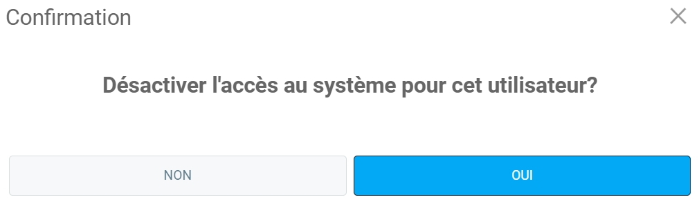 Si vous cliquez sur la corbeille pour désactiver l'usager, le message suivant apparaît: "Désactiver l'accès au système pour cet utilisateur?". Cliquez sur Oui ou Non, selon vos besoins.