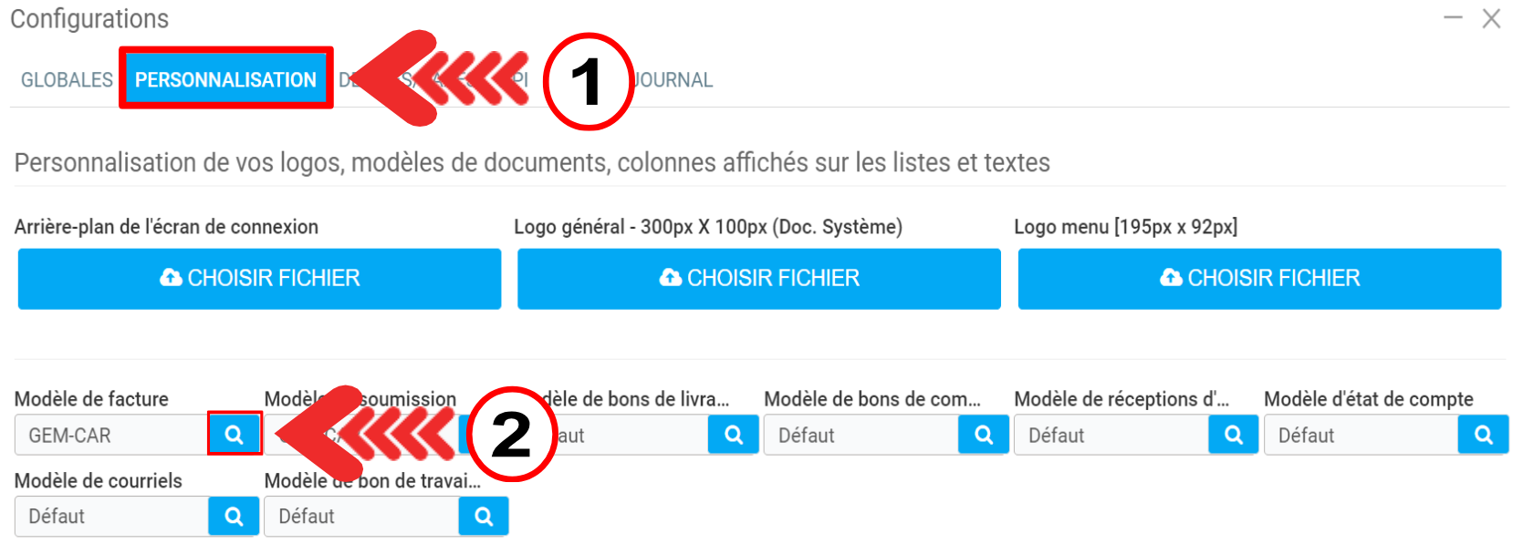Dans la fenêtre suivante, sélectionnez le modèle GEM-CAR pour la facture et pour l'estimé.