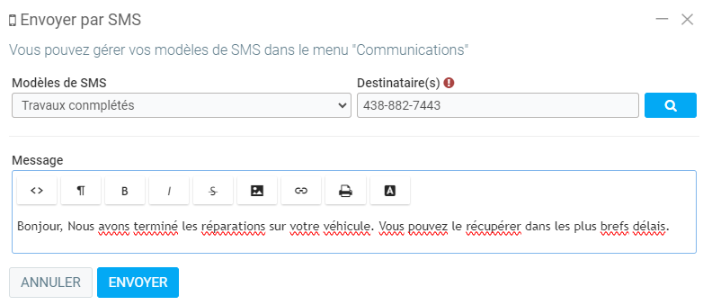 La capacité de votre boutique à envoyer des SMS et à communiquer rapidement avec les clients est cruciale pour maintenir une communication efficace, améliorer la satisfaction des clients et optimiser l'efficacité opérationnelle. Il améliore l'expérience client globale et renforce la relation entre le garage et ses clients.